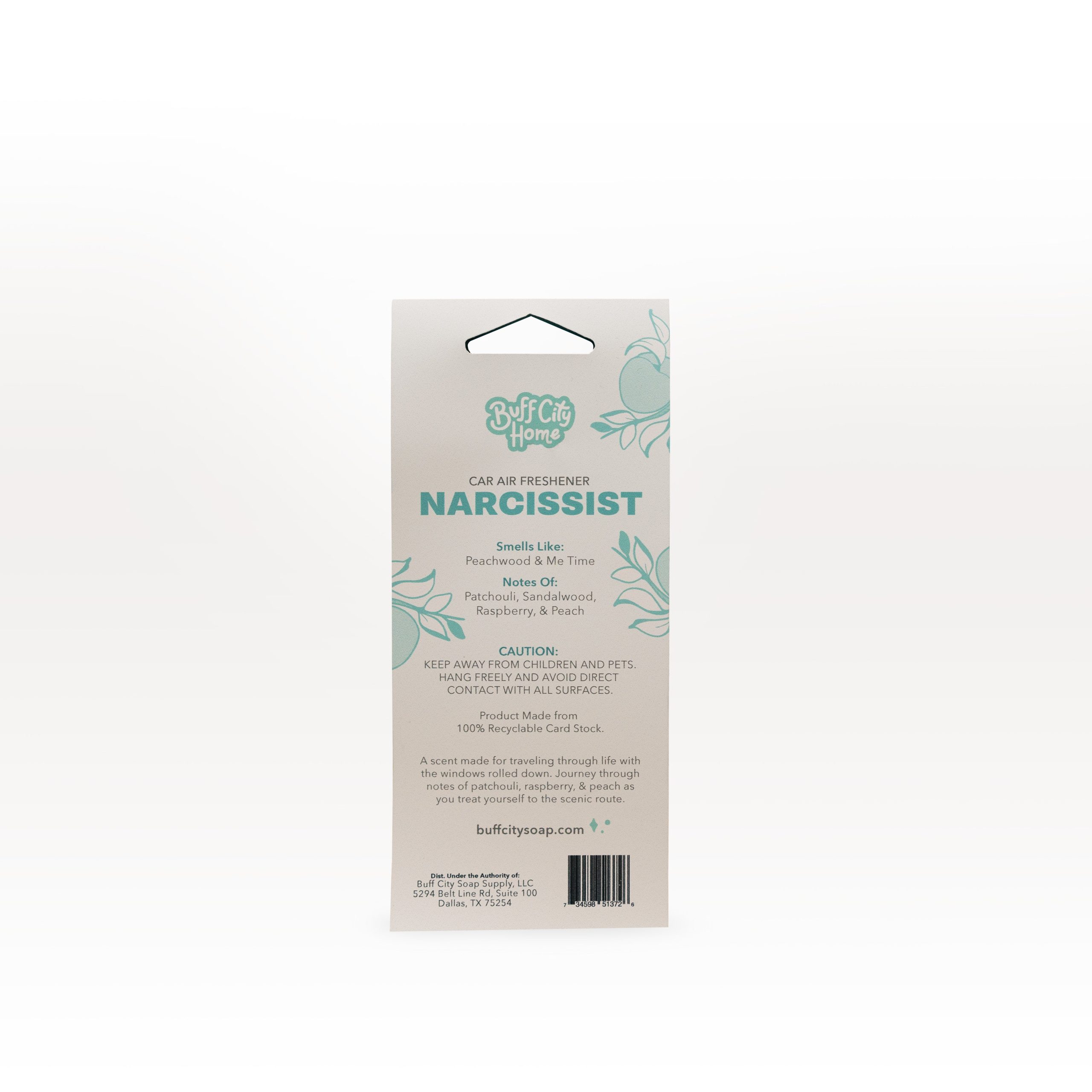 Narcissist Car Air Freshener A scent made for traveling through life with the windows rolled down. Journey through notes of patchouli. raspberry. & peach as you treat yourself to the scenic route.